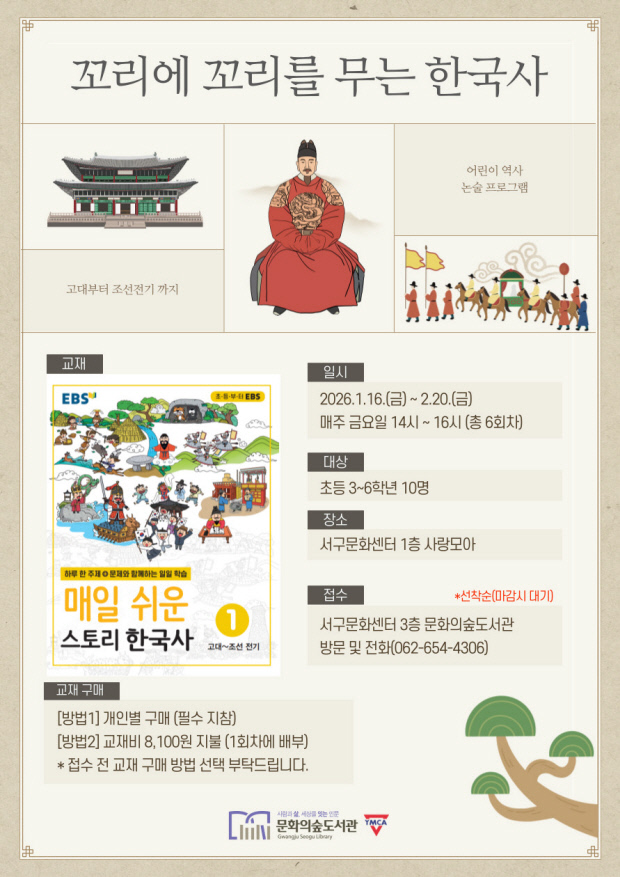 광주 문화의숲도서관이 초등학교 3~6학년을 대상으로 역사 논술 프로그램 ‘꼬리에 꼬리를 무는 한국사(꼬.꼬.한)’를 운영한다.