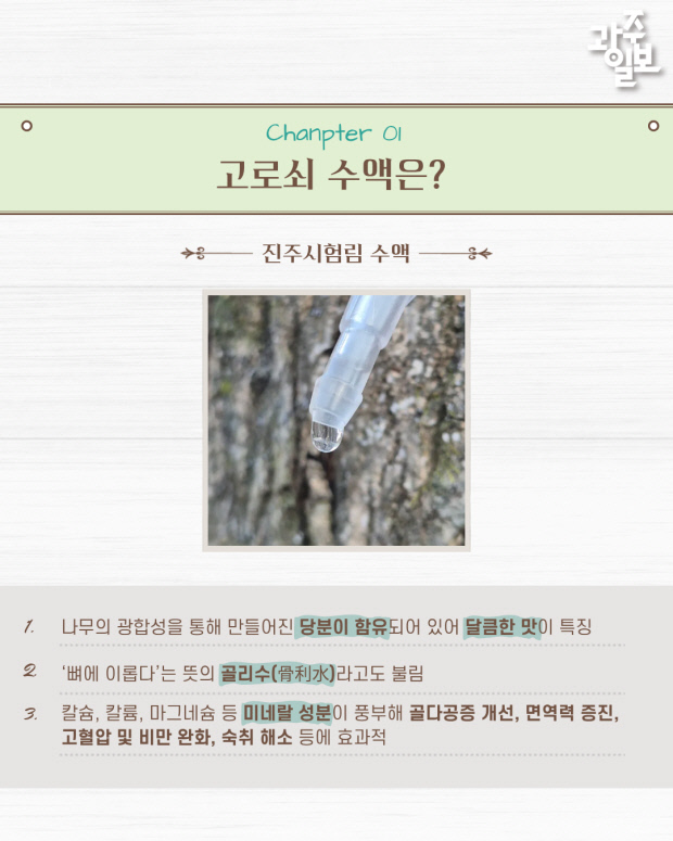 ‘골리수(骨利水)’라고도 불리는 고로쇠 수액은 미네랄 성분이 풍부하여 골다공증 개선과 면역력 증진, 숙취 해소 등에 효과가 있다.