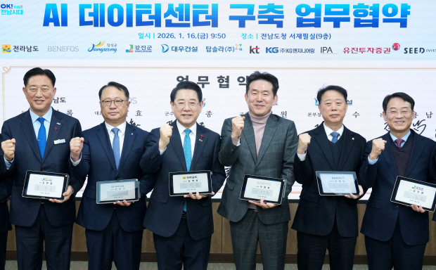 협약에는 전남도, 장성군, 강진군을 비롯, 베네포스, 대우건설, KT, 탑솔라, KG엔지니어링, IPA, 유진투자증권, 시드인베스트먼트 자산운용 등이 참여해 인공지능(AI) 데이터센터 구축에 협력하기로 했다.