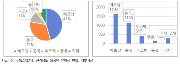 전남연구원이 지난해 펴낸 ‘전남도 외국인 유학생 유치전략 수립 연구’를 보면 2023년 기준 전남 18개 지역대학 외국인 유학생은 3515명으로, 국적별로 보면 베트남이 45.6%(1602명)로 가장 많았고 중국(32.2%), 우즈베키스탄(11.3%), 몽골(3.0%) 등이 뒤를 이었다. 대학교 과정의 경우 베트남과 우즈베키스탄 국적이 다수를 차지했다. 석사 이상 대학원 과정은 중국 국적이 대부분이었다.