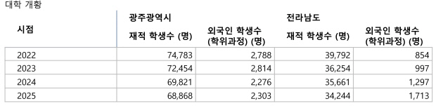 광주·전남 대학 재적 학생 수는 해마다 줄고 있다. 지난 2024년에는 광주 7만명 선이 무너지고, 지난해에는 전남 3만5000명 선 아래로 떨어졌다.