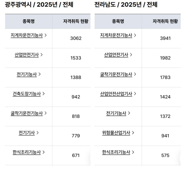 전남은 산업안전기사 1982명, 굴착기운전기능사 1783명, 산업안전산업기사 1424명, 전기기능사 1372명, 위험물산업기사 941명, 한식조리기능사 575명, 건축도장기능사 550명, 전기기사 507명 등이 뒤를 이었다. 전남에서는 지난 2024년에 상위권에 들었던 건설안전기사(598명)와 환경기능사(558명)가 순위에서 빠지고 지난해 건축도장기능사, 전기기사가 상위권에 들었다.