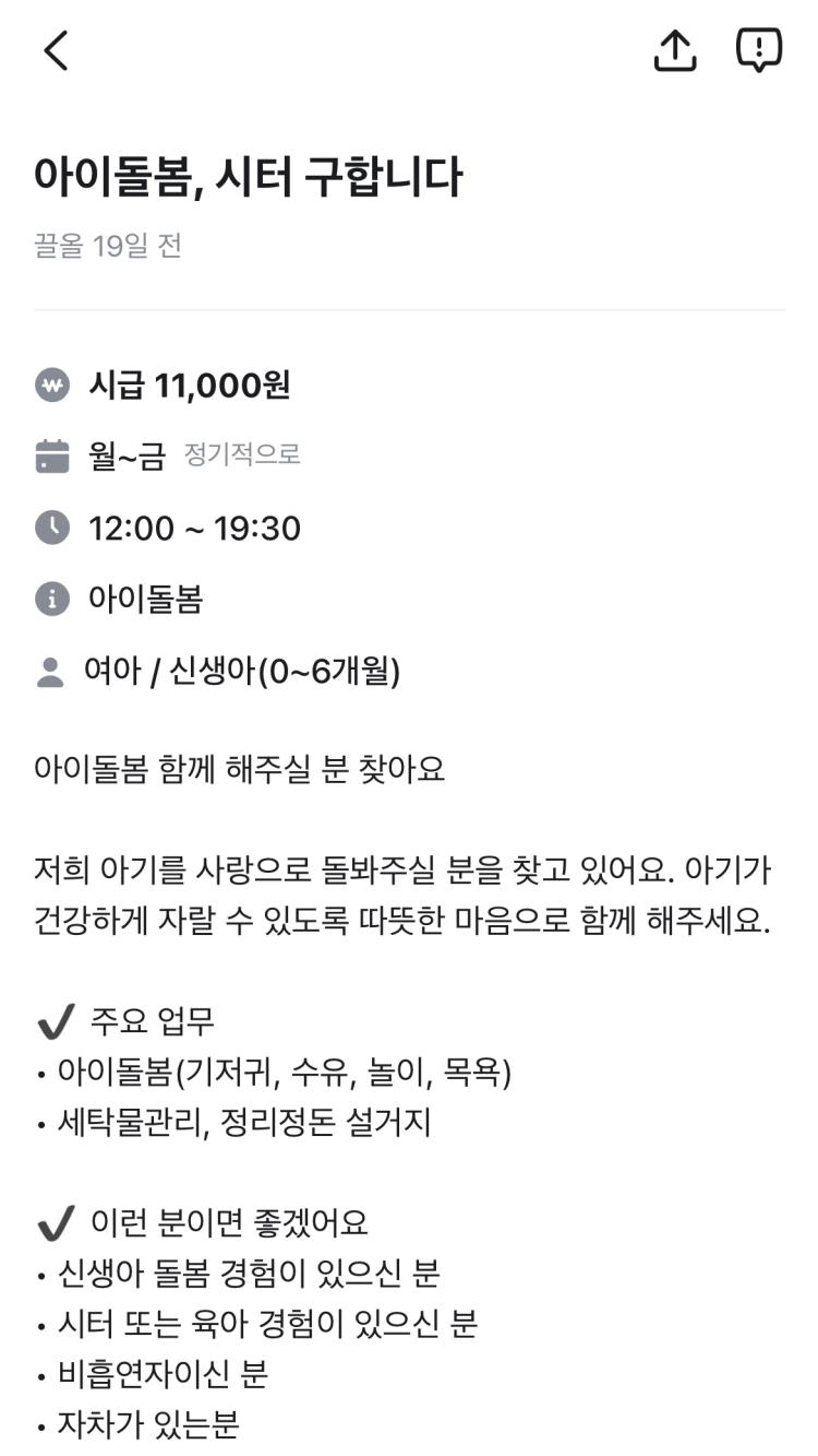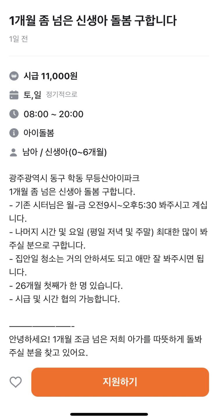 최근 광주시 SNS와 당근마켓 등에 올라온 구인 글에는 아이 하원, 등원 동행, 숙제·놀이 지도, 신생아 돌봄, 사진 촬영 후 전송, 장시간 단독 돌봄, 긴급 상황 책임 대응 등을 요구하는 게시글이 올라왔다. 당근마켓에는 최근 일주일간 육아도우미 구인 글이 약 7건이 확인됐으며 맘카페 등 지역 기반 플랫폼을 합치면 월 20건 이상은 꾸준히 게시되고 있었다.
