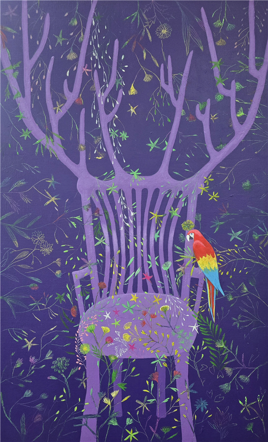 ‘Res’t(쉼)은 다양한 꽃들이 에둘러 피어 있는 의자에 앉아 있는 새를 초점화한 작품이다. 새가 머물며 쉬고 있는 풍경은 훼손되지 않는 순수한 자연을 대변한다. 관객들은 마치 자신을 화폭 속에 깃든 한 마리 새로 치환하는 ‘전도’의 느낌을 받는다. 빠르면서도 두툼한 붓질이 묘사해낸 자연과 인간 내면의 강한 생명력이 조화롭게 구현돼 있다.