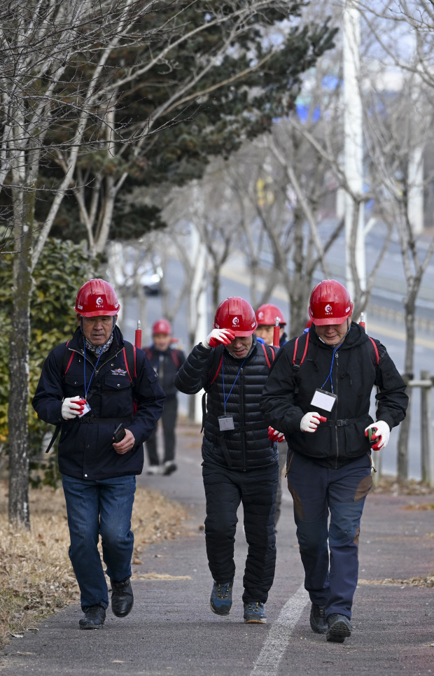 21일 오전 광주 북구에서 열린 ‘산불 감시원 및 산불전문예방진화대 선발 시험’에서 응시자들이 15리터 무게의 등짐펌프를 등에 메고 10분 이내 완주를 목표로 정해진 코스를 힘차게 달리고 있다. /김진수 기자 jeans@kwangju.co.kr
