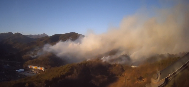 산림당국은 야간 진화를 위해 산불진화·지휘차 등 진화 차량 38대와 산불특수진화대 등을 포함한 인력 322명을 투입해 지상 진화 작업을 이어가고 있다.