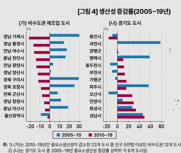 2005년 수도권 도시들의 생산성 평균은 101.4%(100=2005년 전국 평균)로 비수도권(98.7%)과 큰 차이가 없었다. 이후 2019년에는 수도권 생산성이 121.7%로, 비수도권(110.6%)을 크게 앞섰다. 광주 생산성은 2005년 91.9%에서 2019년 98.9%로 올랐다.