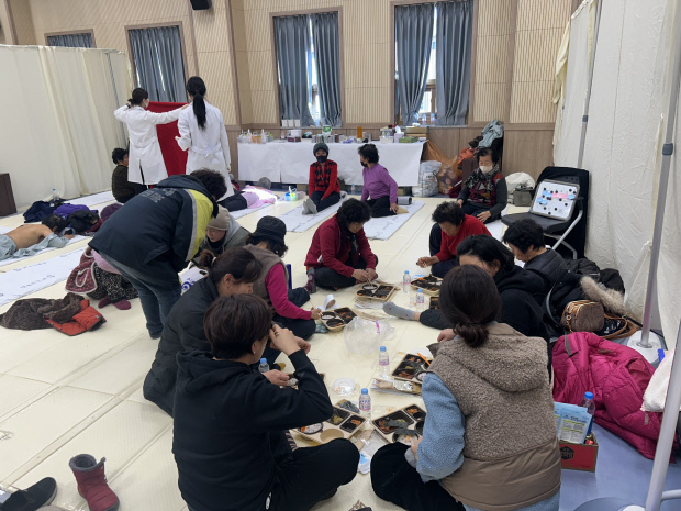 | 22일 광양시 옥곡면에 마련된 화재 임시 대피소인 옥구슬건강문화센터에서 주민들이 점심으로 배분된 도시락을 먹고 있다. |