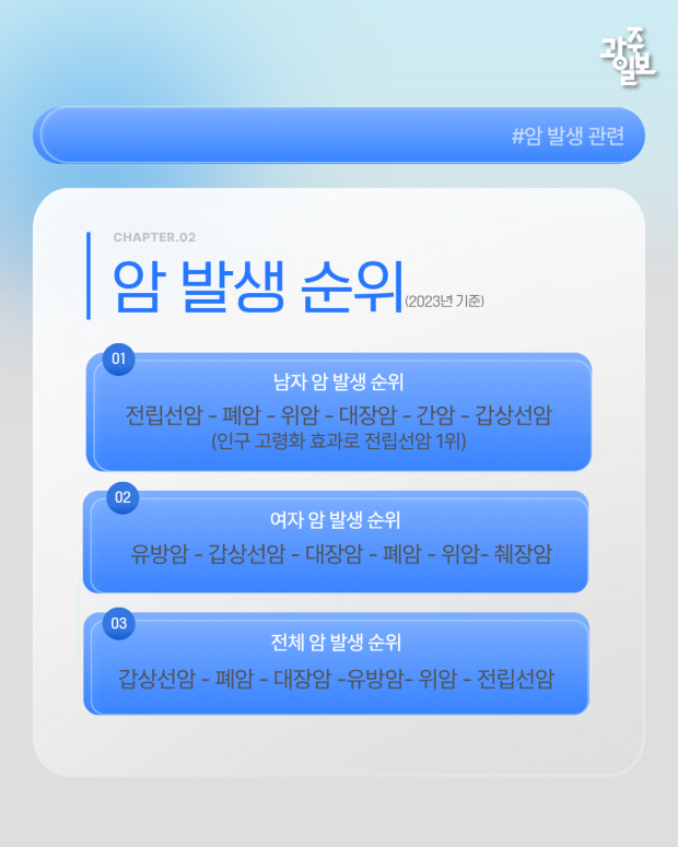 2023년 남녀 전체에서 가장 많이 발생한 암은 갑상선암이었으며, 특히 인구의 고령화 효과로 전립선암이 남성암 1위가 되었다.
