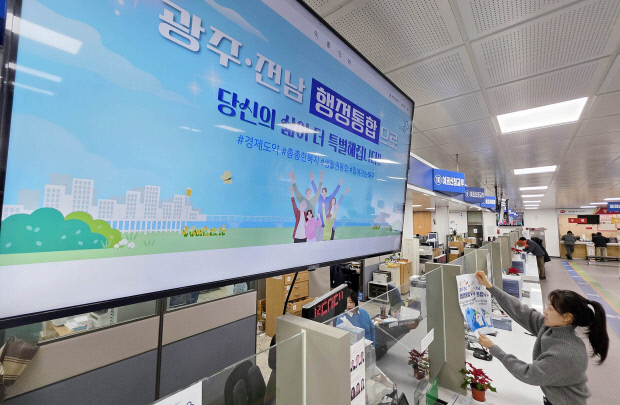 광주·전남 행정통합이 급물살을 타고 있는 가운데 지난 23일 광주 북구청 민원실 모니터에 ‘광주·전남 행정통합으로 당신의 삶이 더 특별해집니다’란 홍보문구가 송출되고 있다. /나명주기자mjna@kwangju.co.kr