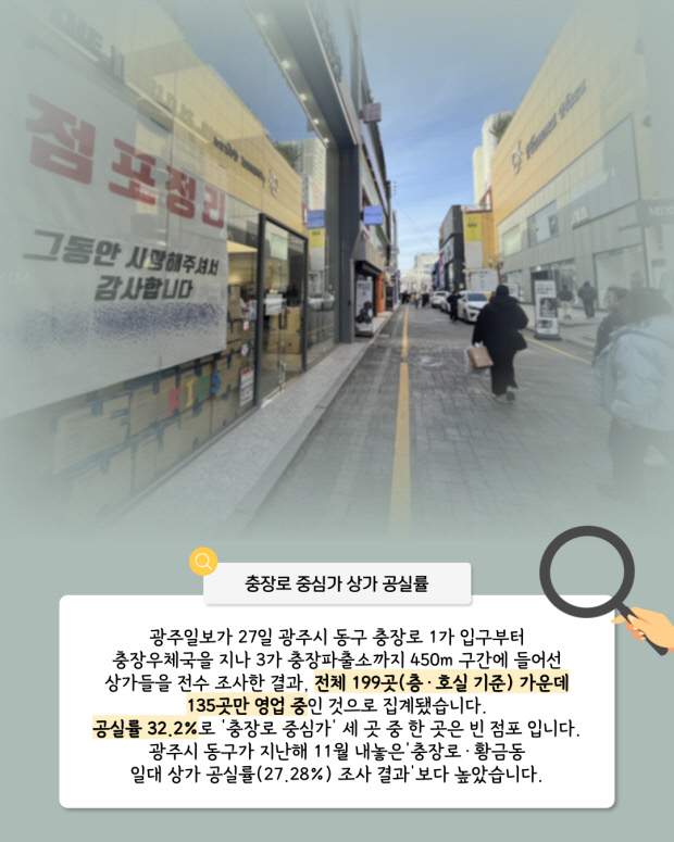 광주일보가 충장로 1~3가 일대 상가 199곳을 조사한 결과, 64곳이 비어 공실률은 32.2%로 집계됐다. 충장파출소와 문화전당 인근에 공실이 집중됐으며, 장기간 방치된 점포도 쉽게 찾아볼 수 있다.