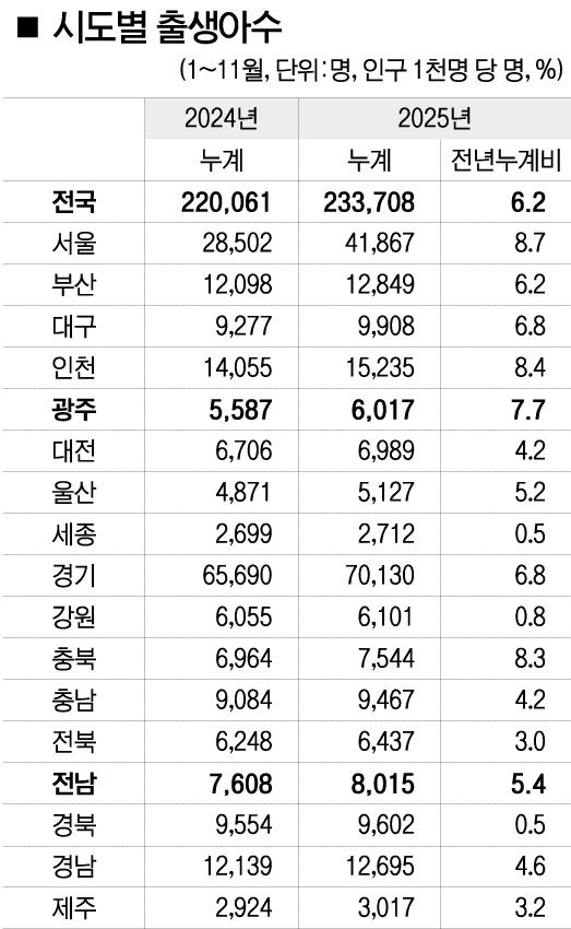 지난해 1~11월 광주와 전남에서 1만 4000여명의 아기가 태어났다. 광주·전남 모두 전년 대비 출생아 수가 증가했으며, 특히 광주는 전국에서 4번째로 출산 증가율이 높았다.