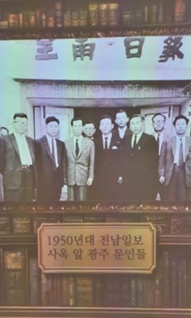 | 1950년대 광주일보(옛 전남일보) 사옥 앞에서 광주 문인들이 포즈를 취했다. |