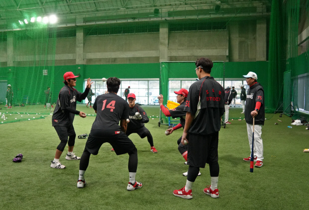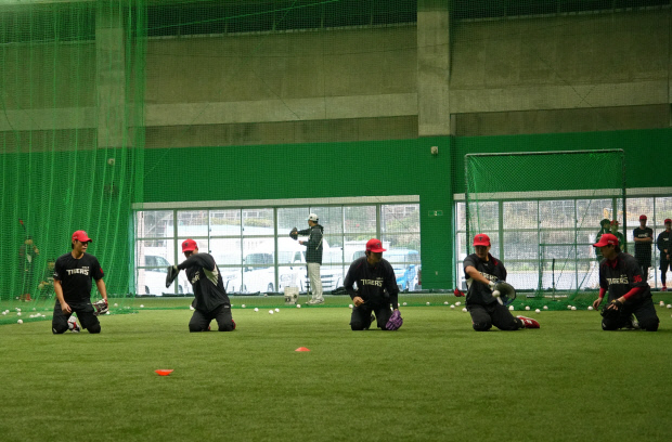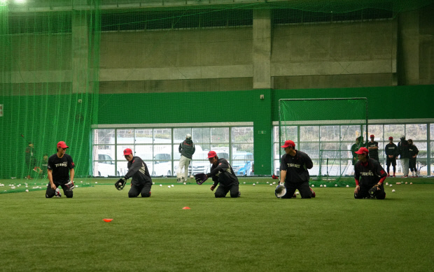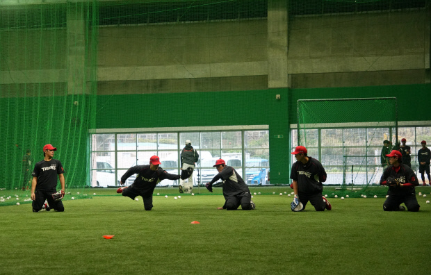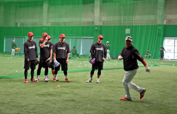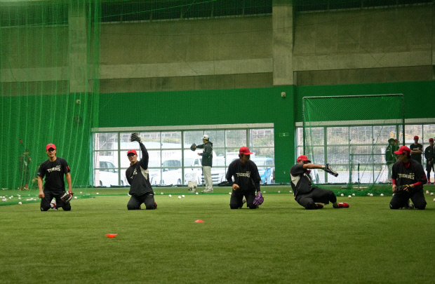 한 번에 3개의 공이 날아왔기 때문입니다. 이범호 감독(가운데)까지 가세해서 박기남, 김연훈 코치와 펑고를 치면서 선수들은 동시에 날아오는 공들을 처리하느라 분주했습니다. 집중해서 공을 보고, 안정적으로 포구해야 하는 만큼 초집중 상태로 펑고를 받은 선수들은 게임으로 긴장감을 풀기도 했습니다 .