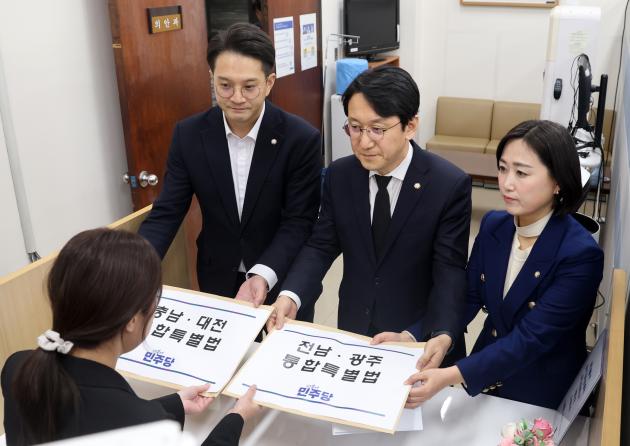 더불어민주당 천준호(가운데) 원내운영수석부대표, 전용기(왼쪽) 원내소통수석부대표, 백승아 원내대변인이 지난 30일 국회 의안과에 전남광주통합특별법안과 충남대전통합특별법안을 제출하고 있다. <사진공동취재>