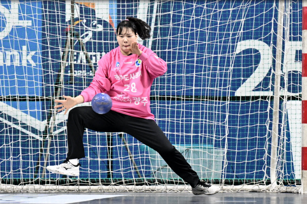 광주도시공사 이민지 골키퍼가 1일 광주 빛고을체육관에서 열린 서울시청과의 신한 SOL Bank 2025-2026 핸드볼 H리그 여자부 1라운드 경기에서 슛을 막아내고 있다. 이민지는 이날 7세이브를 기록하며 골문을 지켰다. <한국핸드볼연맹 제공>