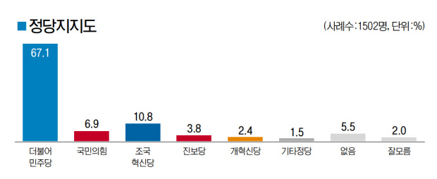 10명 중 7명가까이가 민주당을 지지하고 있는 셈이다. 조국혁신당은 10.8%로 그 뒤를 이었다.
