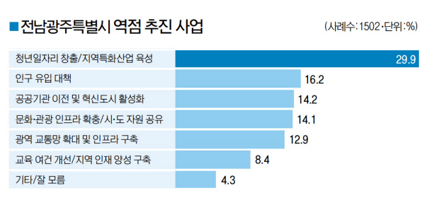 광주시민과 전남도민 세 명 중 한 명은 ‘전남·광주통합특별시’ 출범 이후 가장 중점을 둬야할 사업으로 ‘청년일자리 창출 및 지역특화산업 육성’을 선택했다.