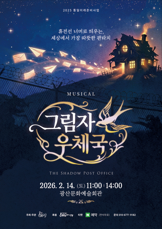 광주 예술단체 예락은 오는 14일 오전 11시와 오후 2시 광산문화예술회관에서 통일창작뮤지컬 ‘그림자 우체국’을 선보인다. ‘2025 통일미래준비사업’ 선정작인 이번 작품은 아날로그적 오브제와 판타지적 상상력을 결합해 세대 간 단절과 회복의 이야기를 풀어낸다.