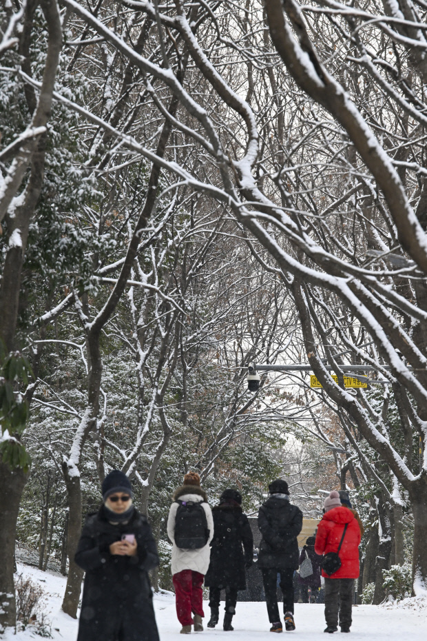 새벽사이 눈이 내린 2일 오전 광주 동구 푸른길 공원 산책로에서 시민들이 하얗게 눈이 내려앉은 나무 사이를 지나가고 있다. /김진수 기자 jeans@kwangju.co.kr