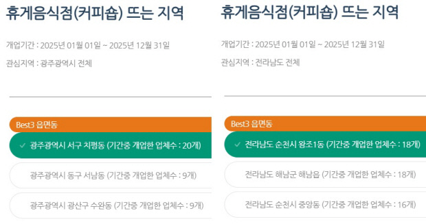 지난해 전남에서 편의점이 가장 많이 생긴 읍·면·동은 함평군 함평읍(8개), 순천시 왕조1동(4개), 목포시 상동(3개) 등으로 나타났다. 커피전문점은 순천시 왕조1동 (18개), 해남군 해남읍(18개), 순천시 중앙동(16개) 등에 활발히 개업했다. 체육도장업은 여수시 문수동(2개), 무안군 일로읍(2개), 목포시 부흥동(1개) 등에서 새로 생겨났다.