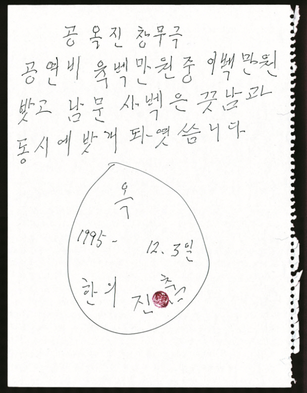 | 공옥진 여사가 손으로 쓴 계약서. 인주 대신 립스틱을 발라 도장을 찍었다. |