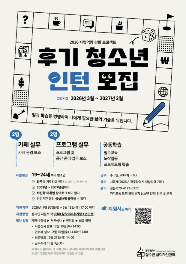 지원 대상은 대학에 진학하지 않았거나 현재 미취업 상태인 19~24세 청소년이다. 접수는 삶디센터 누리집을 통해 오는 13일까지 진행되며, 서류 심사와 면접을 거쳐 27일 최종 합격자를 발표한다. 선발된 인원은 3월 3일부터 활동을 시작할 예정이다.