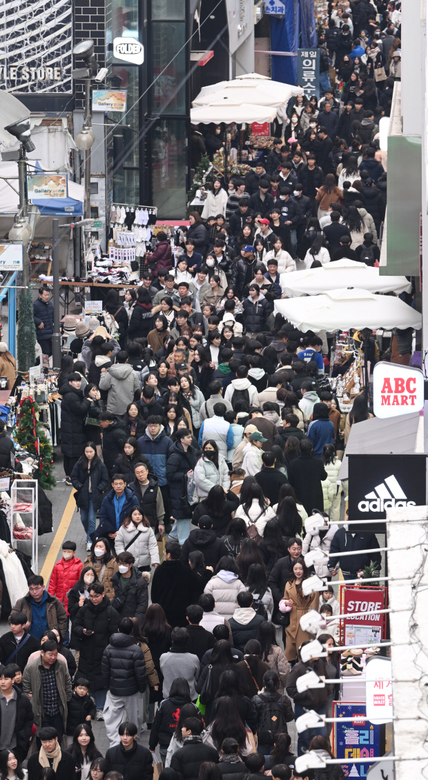 광주시 동구 충장로 상권이 재도약하기 위해서는 장기 재생 전략을 통해 차별화된 거리 브랜드를 구축해야 한다는 지적이 나온다. 지난 2024년 성탄절 충장로가 모처럼 붐비고 있다. /나명주 기자 mjna@