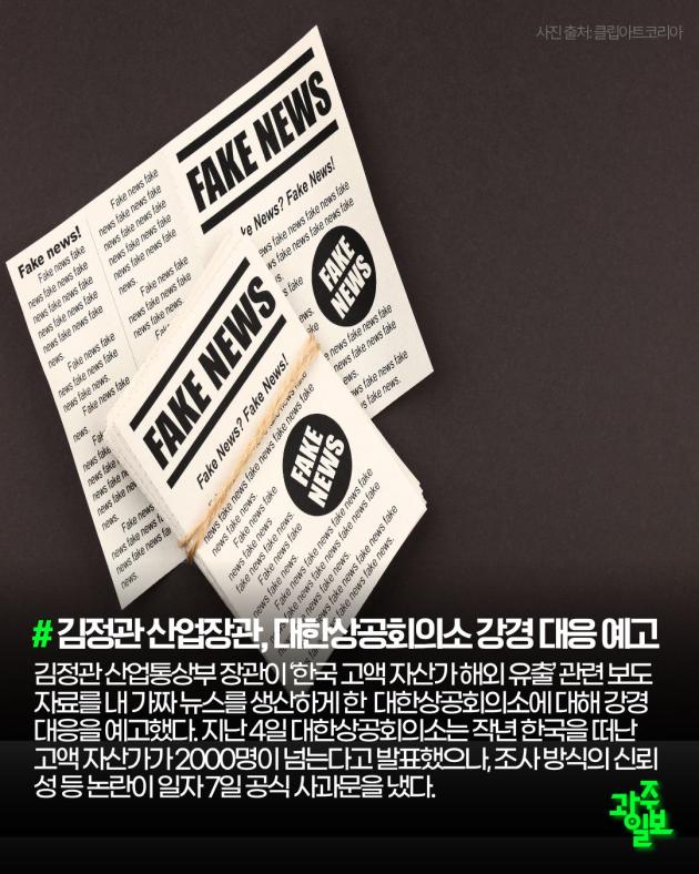 정관 산업통상부 장관이 ‘한국 고액 자산가 해외 유출’ 관련 보도자료를 내 가짜 뉴스를 생산하게 한 대한상공회의소에 대해 강경 대응을 예고했다. 지난 4일 대한상공회의소는 작년 한국을 떠난 고액 자산가가 2000명이 넘는다고 발표했으나, 조사 방식의 신뢰성 등 논란이 일자 7일 공식 사과문을 냈다.