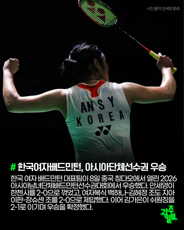 한국 여자 배드민턴 대표팀이 8일 중국 칭다오에서 열린 2026 아시아남녀단체배드민턴선수권대회에서 우승했다. 안세영이 한첸시를 2-0으로 꺾었고, 여자복식 백하나-김혜정 조도 지아이판-장슈셴 조를 2-0으로 제압했다. 이어 김가은이 쉬원징을 2-1로 이기며 우승을 확정했다.