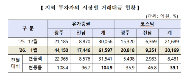 10일 한국거래소 광주혁신성장센터가 발표한 ‘2026년 1월 광주·전남지역 상장법인 증시동향’에 따르면 1월 중 광주·전남지역 투자자들의 거래대금은 9조 1766억원으로 전월(5조 1744억원) 대비 4조 22억원(77.3%) 상승했다.