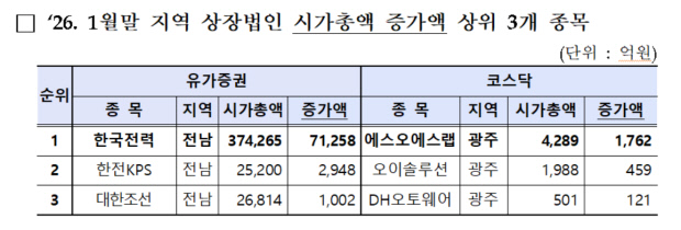 유가증권시장에서 지역 상장법인 중 1월 말 기준 한전 시총은 37조 4265억원으로 전월 대비 7조 1258억원 올라 증가액이 가장 컸다. 이어 한전KPS(2조 5200억원·2948억원↑), 대한조선(2조 6814억원·1002억원↑) 등 에너지·조선주 등이 강세를 보였다. 특히 한전과 한전KPS 시총은 각각 23.5%, 13.2% 오르며 증가율 기준 상위 3개 종목에 이름을 올리기도 했다.