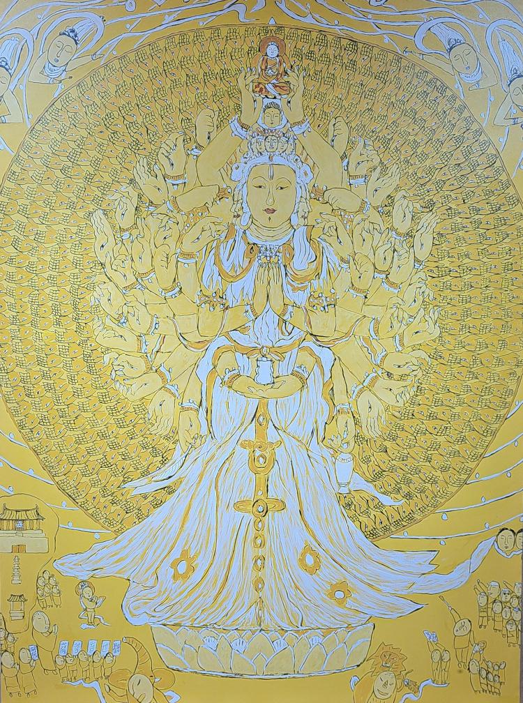 황영성 화백 49재일을 맞아 오는 13일 무각사 로터스갤러리에서 추모기획전(3월 31일까지)이 열린다. 전면에 보이는 작품은 ‘반야심경-가족이야기’, 오른쪽은 대형 작품 ‘반야심경’.