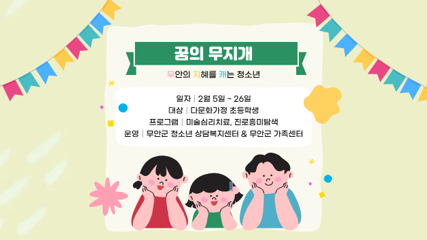 무안군 청소년상담복지센터가 26일까지 다문화가정 초등학생을 대상으로 지역 특성화 집단상담 프로그램 ‘꿈의 무지개’를 운영한다. 프로그램은 미술심리치료와 진로흥미탐색으로 구성됐으며, 청소년들의 자존감 향상과 미래를 구체적으로 설계할 수 있는 기회가 될 전망이다.