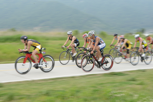 | 공원에서 펼쳐진 철인 3종 경기 모습. <경남시 제공> |