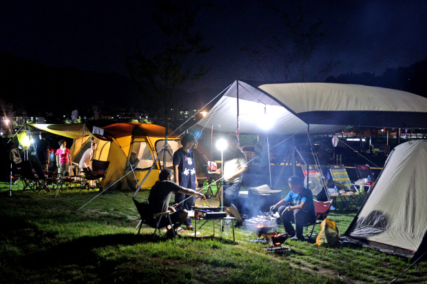 | 황산공원 캠핑장에서 가족 방문객이 야영을 즐기고 있다. <경남시 제공> |