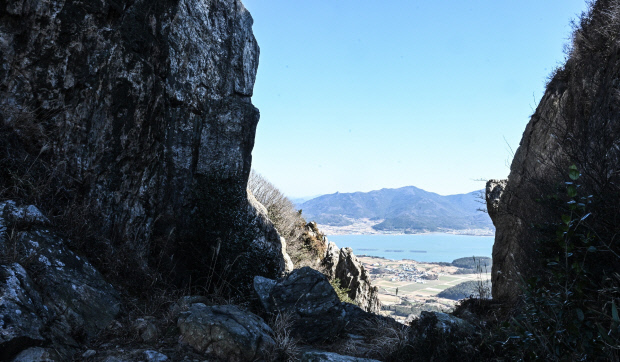 | 달마산 문바위에 올라선 순간, 능선 아래로 들녘과 바다가 한눈에 들어온다. /최현배 기자 |