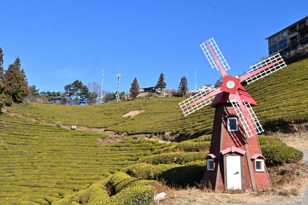 | 차밭 풍경 속에 놓인 빨간 풍차. 차분한 겨울 차밭 사이에 작은 포인트가 된다. /최현배 기자 |