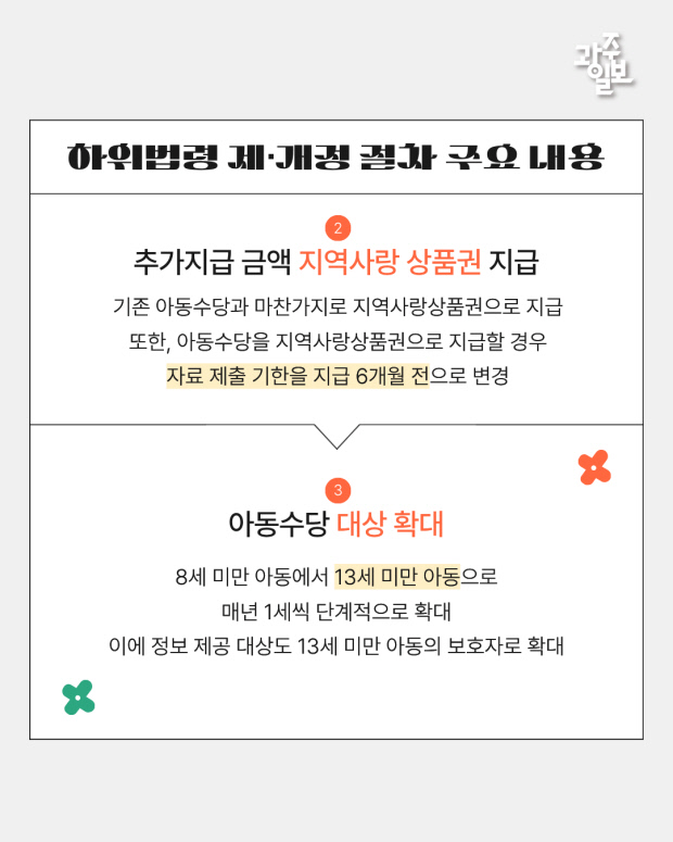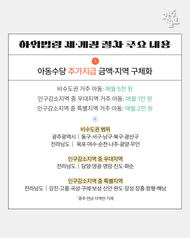 아동 수당 대상을 8세 미만에서 13세 미만 아동으로 확대하고, 비수도권 및 인구감소지역에 거주하는 아동에게 추가 수당을 지급하는 내용 등을 담고 있다.