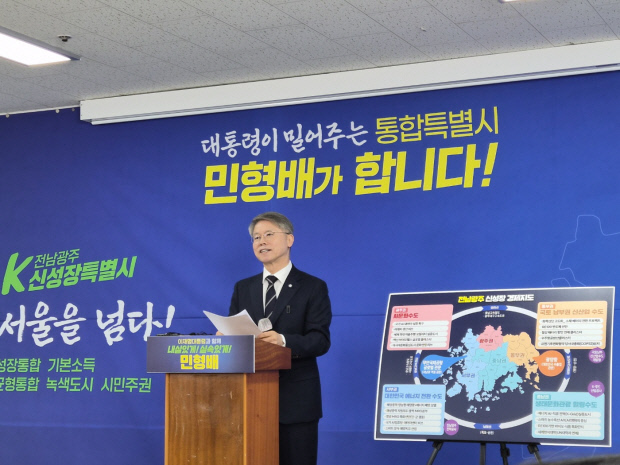 더불어민주당 민형배(광산을) 국회의원이 “전남광주특별시를 에너지를 생산하고 인공지능(AI)를 실증하며 우주와 농생명이 결합된 신산업주도형 경제권으로 도약시키겠다”며 “‘전남광주전력공사’와 ‘K푸드산업공사’ ‘국토남부권 신산업수도 개발청’을 설치하겠다”고 밝혔다.