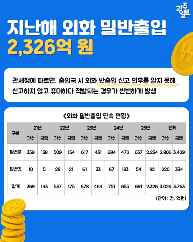 2025년 관세청이 적발한 외화 밀반출입은 총 691건, 규모는 2326억 원에 달한다. 이 가운데 신고 의무를 알지 못한 채 자금을 휴대하다 적발된 사례도 적지 않다.
