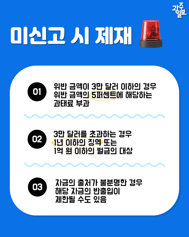 신고를 누락했다가 적발될 경우 위반 금액이 3만 달러 이하이면 위반 금액의 5%에 해당하는 과태료가 부과된다. 3만 달러를 초과하면 1년 이하의 징역 또는 1억 원 이하의 벌금에 처해질 수 있어 주의가 필요하다.