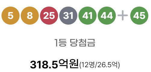 21일 진행된 제1212회 로또복권 추첨에서 ‘5, 8, 25, 31, 41, 44’가 1등 번호가 됐다.