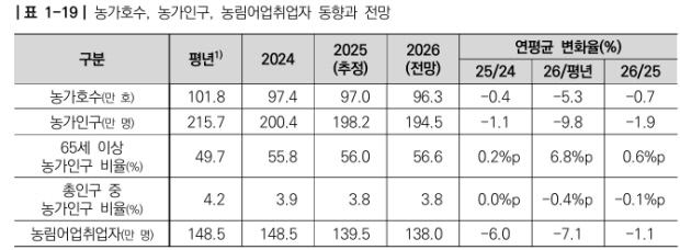농림어업취업자 수도 2024년 148만 5000명, 2025년(추정) 139만 5000명, 2026년(전망) 138만명 등 꾸준히 감소할 것으로 예상됐다.