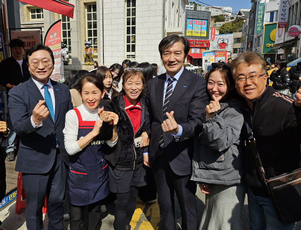 조국혁신당 조국(왼쪽 네번째) 대표가 22일 오전 여수시를 방문해 여수시장 출마를 선언한 명창환(맨 왼쪽) 전 전남도 행정부지사와 상인들을 만나 사진 찍고 있다. <명창환 예비후보 측 제공>