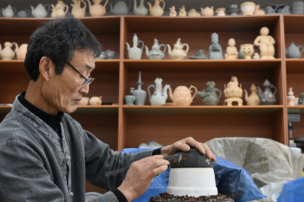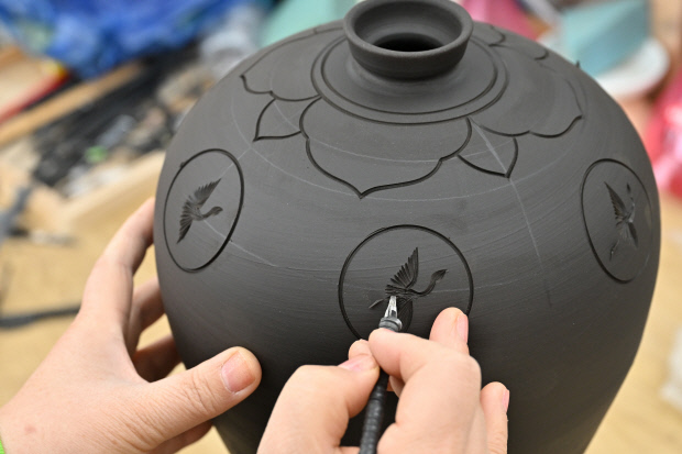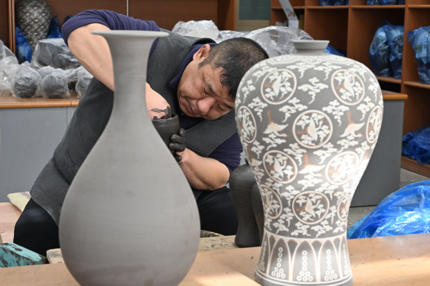 | 청자재현연구동에서 도공이 매병에 조각장식을 하고 있다. /최현배 기자 |