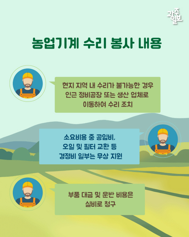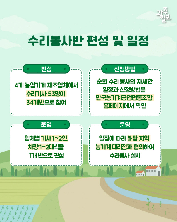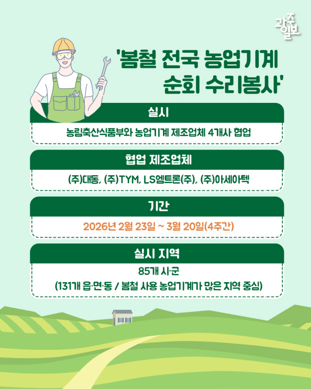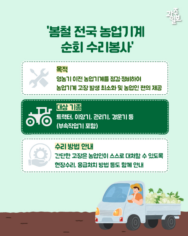 이번 순회 봉사는 23일부터 3월 20일까지 4주간 85개 시·군, 131개 읍·면·동에서 진행되며, 트랙터·이앙기·관리기·경운기 등 봄철에 사용량이 많은 농업기계를 대상으로 안전점검 및 수리·정비가 이뤄진다.