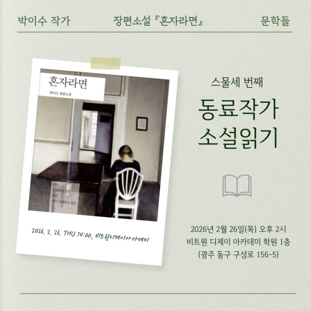 박 작가의 장편 ‘혼자라면’을 함께 읽고 나누는 시간이 마련됐다. 오는 26일 오후 2시 광주시 동구 비트원 디제이아카데미 1층.