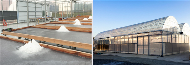| 친환경 스마트 염전 채염하는 모습(좌)과 스마트 염전 외관(우). |