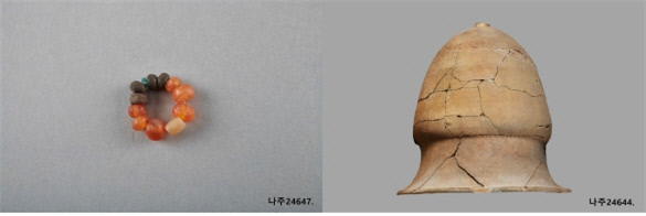 | 함평 예덕리 고분군 출토 유물인 구슬(왼쪽), 독널. <국가유산청 제공> |